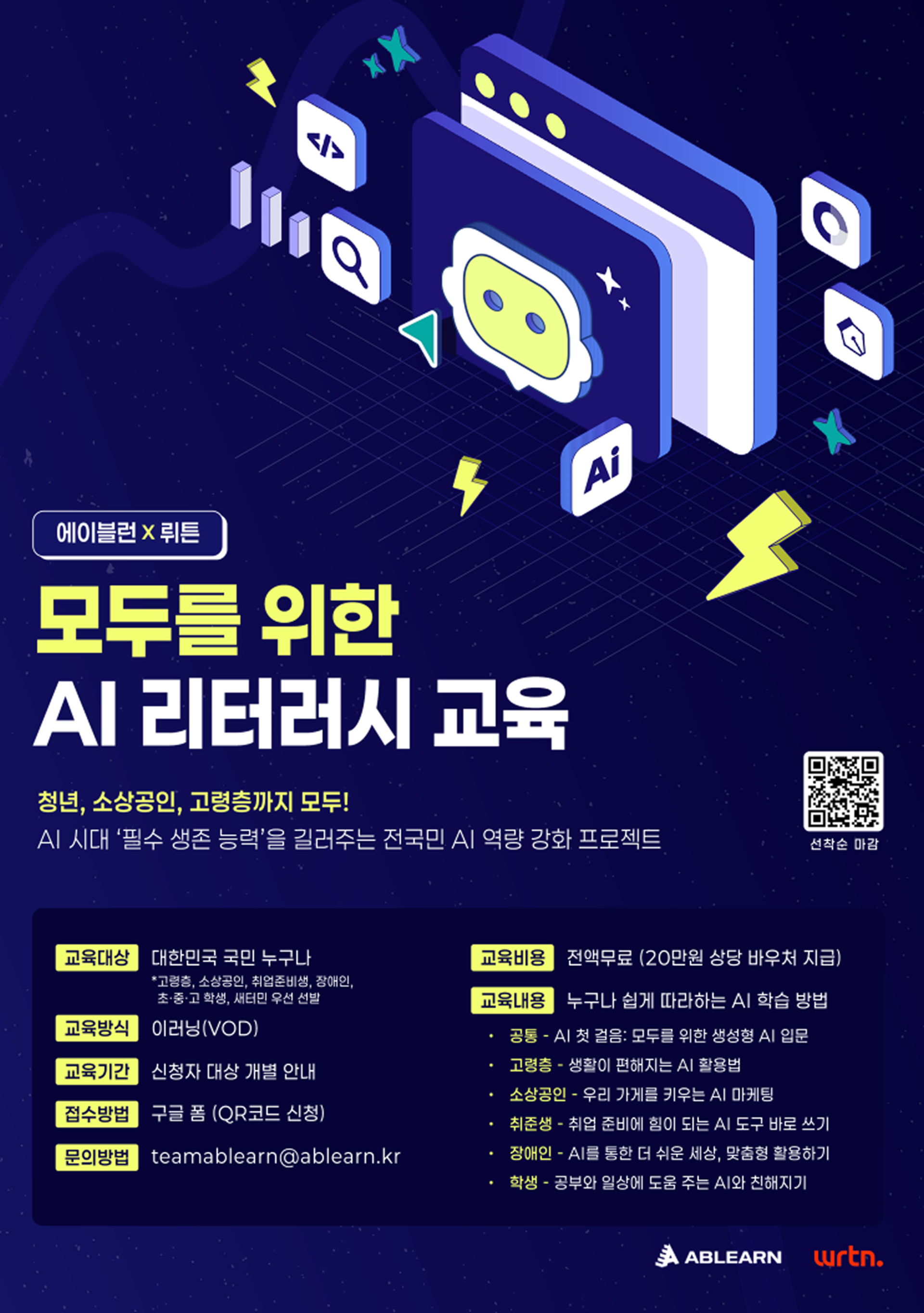 AI 교육 전문기업 에이블런과 AI 솔루션 기업 뤼튼이 함께 전 국민 AI리터러시 역량 강화를 목표로, 1인당 200,000원 상당의 <모두를 위한 AI리터러시 교육>을 수강할 수 있는 'AI 교육 바우처'를 지원합니다.