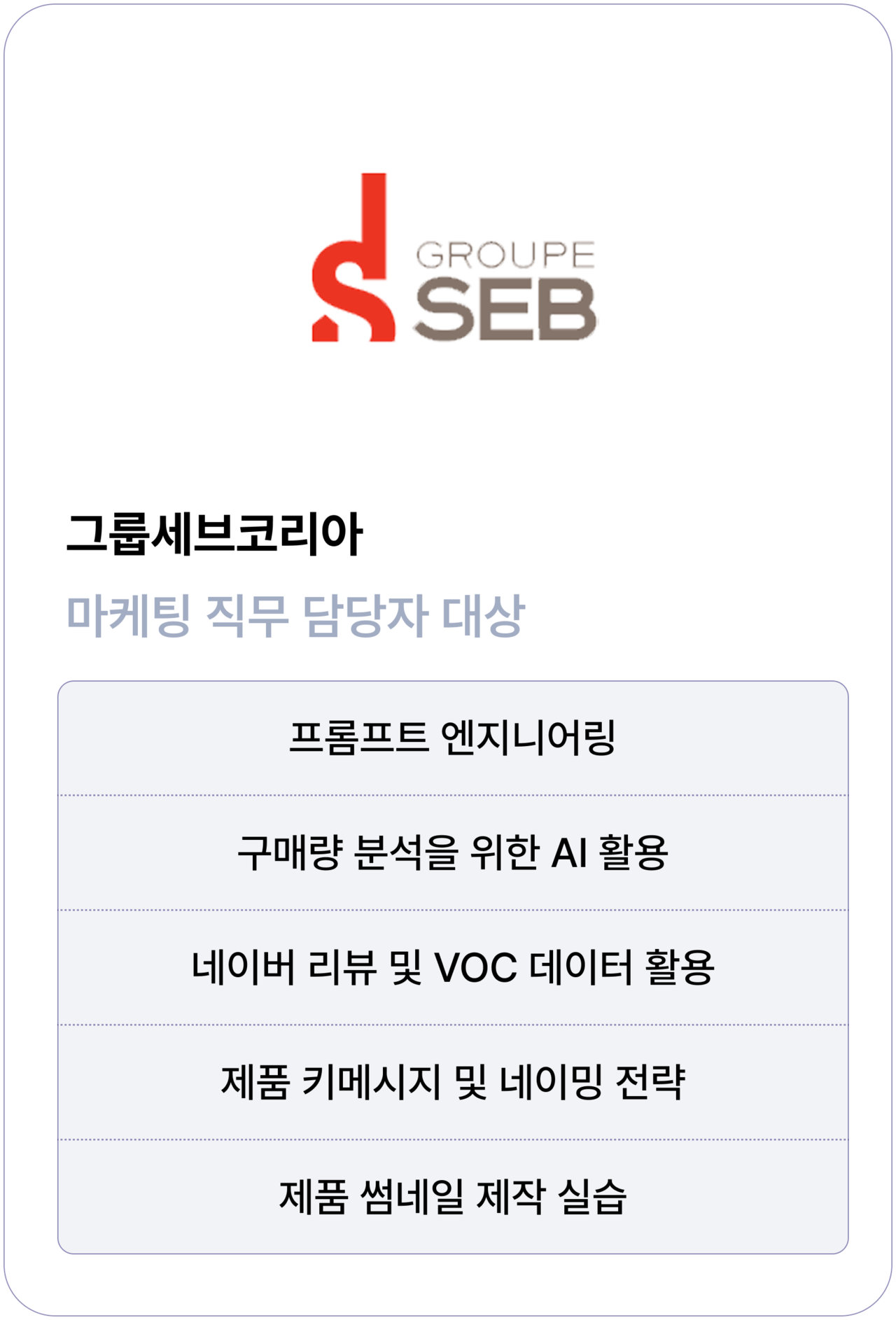 ❸ 전문가 직강 & 퍼실리테이터 보유 | 현장 경험이 있는 AI/DT 전문가가 직접 강의하고,퍼실리테이터 인증을 받은 매니저가 교육을 관리합니다. |