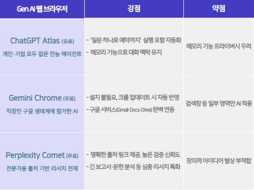 ChatGPT, Gemini, Perplexity ๋ฑ ์ฃผ์ GenAI ๋ชจ๋ธ๋ค์ ๊ฐ๊ฐ Atlas, Chrome, Comet๋ฅผ ์๋น์คํ๋ฉฐ, ์น์ดํ AI ์น ๋ธ๋ผ์ฐ์ ๊ฒฝ์์ ํผ์น๊ณ ์์ด์. ๊ฐ๊ฐ์ ๋ธ๋ผ์ฐ์ ๊ฐ ์ด๋ค ํน์ง์ ๊ฐ์ง๊ณ ์๋์ง ๋น๊ตํด ๋ณผ๊น์?
