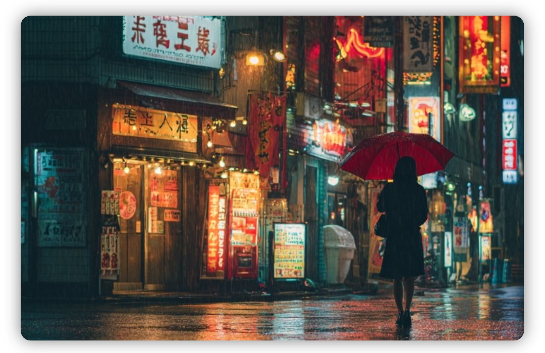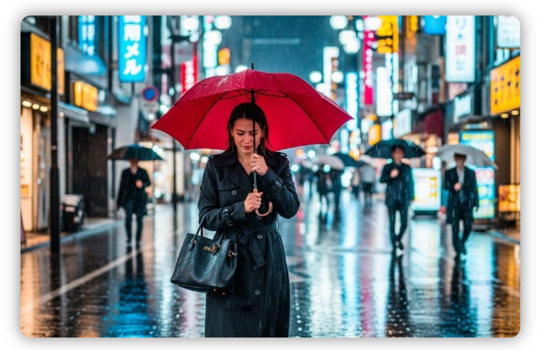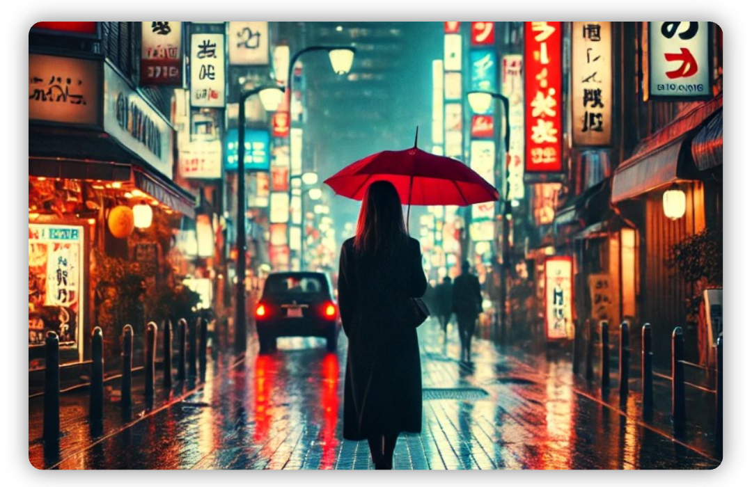 A woman holding a red umbrella walking on a rainy street in Tokyo, neon signs reflecting on the wet pavement