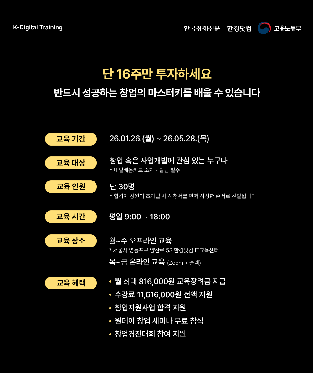 창업의 전 과정을 단 16주 만에 완성합니다.